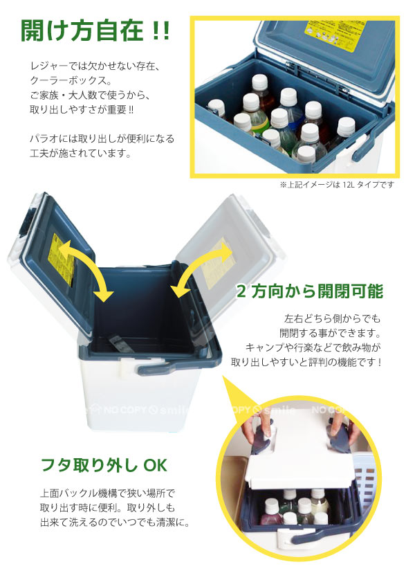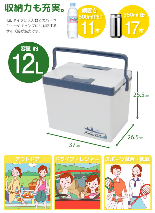 ) ▼レジャークーラーパラオシリーズ▼ レジャークーラーパラオ7L レジャークーラーパラオ12L レジャークーラーパラオ20L サイズ (約)外寸幅37×奥行26.5×高さ26.5cm 内寸幅28×奥行17.5×高さ21cm 最大容量 (約)12L 素材・材質 本体・フタ・ハンドル/ポリプロピレン、バックル・ヒンジ/ABS樹脂、断熱材/発泡スチロール 重量 (約)1660g