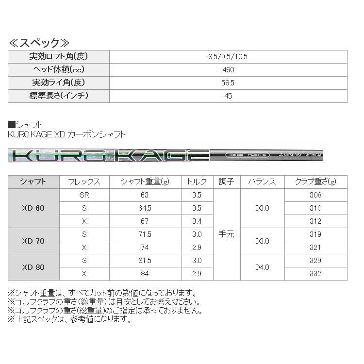 ■TS3ベネフィット・想像を超える飛距離性能・かつてないボールスピードと高い許容性・重心調整機能によるマルチな弾道・芯で打ち抜く確かな打感≪スペック≫実効ロフト角(度)9.5/10.5ヘッド体積(cc)460実効ライ角(度)58.5標準長さ(インチ)45.0■シャフト KUROKAGE XD カーボンシャフト シャフト フレックス シャフト重量(g) トルク 調子 バランス クラブ重さ(g) XD 60 SR 63 3.5 手元 D3.0 308 S 64.5 3.5 310 X 67 3.4 312 XD 70 S 71.5 3.0 D3.0 319 X 74 2.9 321 XD 80 S 81.5 3.0 D4.0 329 X 84 2.9 332 ※シャフト重量は、すべてカット前の数値になっております。